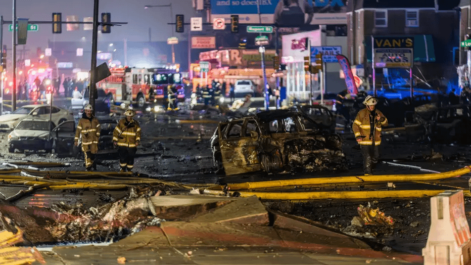 Witnesses described shrapnel from the crash damaging cars and sending burning debris into the streets. Photos of the aftermath show burning cars mangled.