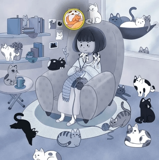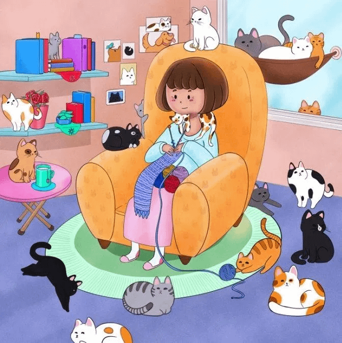 A girl is sitting on a couch and surrounded by many cats. Your task is to find the dog hidden in this image. Are you ready?