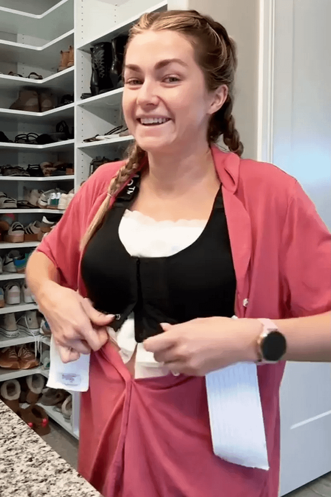 Her surgeon also gave her a Galaflex mesh bra, which she explains is “is an internal mesh bra” that is “really just to help get support on the bottom, which I love so much.”